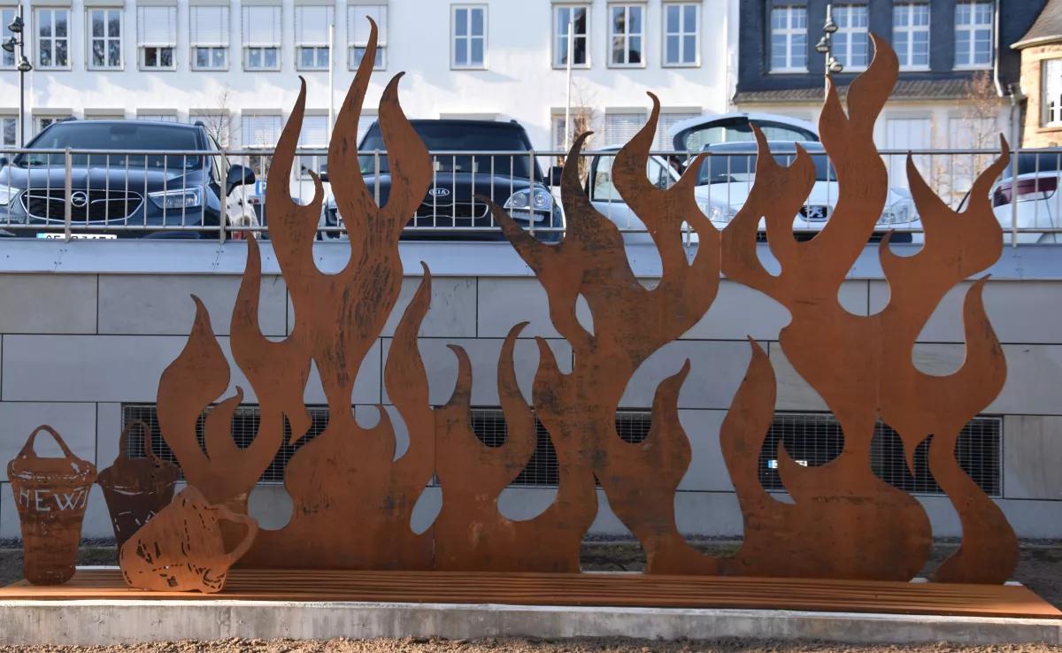 Die Flammen am Feuerteich stehen dabei für das Schützenwesen. Markus Harnischmacher, der gemeinsam mit Klaus Ortmann zu den Ideengebern zählt, erklärte, dass die Aufgabe der Schützen in früheren Zeiten mit schützen im Sinne von Schutz assoziiert war und ihre Hilfe beim Löschen von Bränden auch in der Löschordnung von 1784 hinterlegt ist.