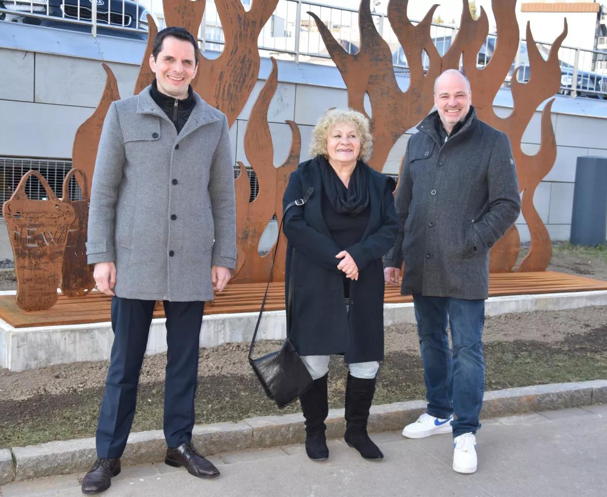 Künstlerin Marlies Backhaus blickte auf die Entstehung ihres drei Meter hohen und sechs Meter breiten Werkes zurück, das passend zum Feuerteich entstanden ist: „Ich hatte sofort Assoziationen mit der historischen Stätte gehabt und habe zunächst an Eimer zum Löschen gedacht.