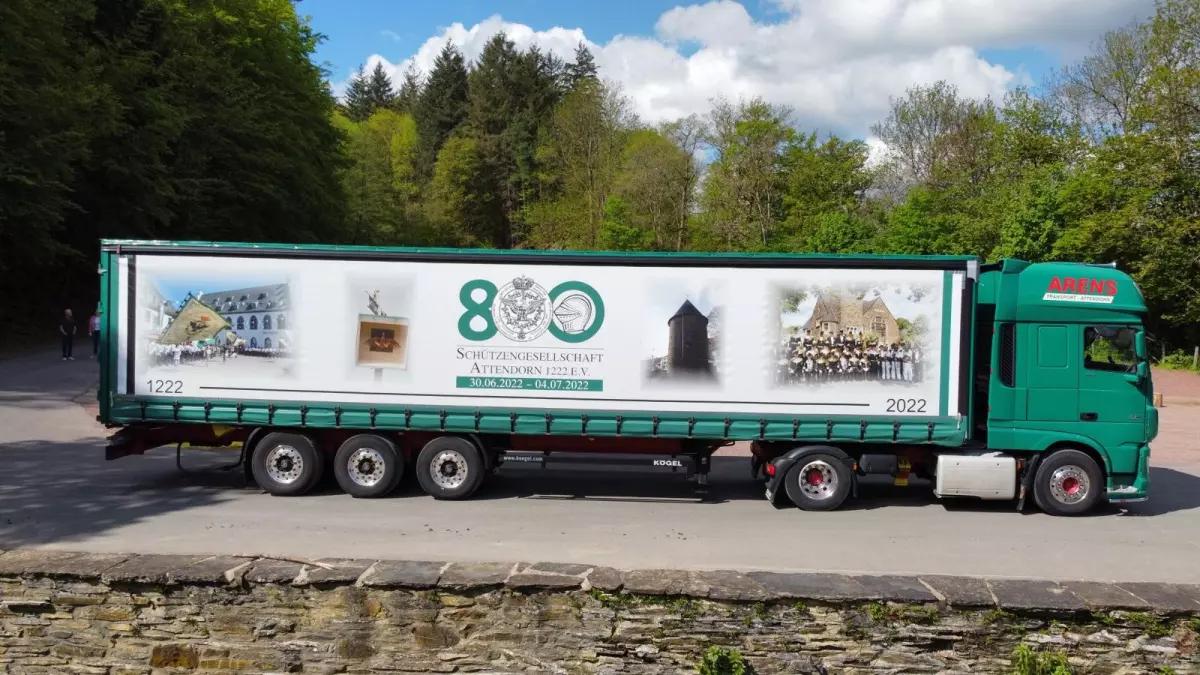 Sofort begeistert war auch Franjo Arens, der ältere Bruder von Ralf Arens und Chef von Arens Transport. Mit ins Boot geholt wurde dann die Firma Elsner & Eckert aus Kreuztal, Profis für die Herstellung von Planen sowie Fahrzeugbeschriftung. Seit einigen Wochen fährt der rollende Schützen-Truck durch Deutschland und macht überall Werbung für das Jubiläumsfest 2022. „Das ist ein richtiger Hingucker und toll geworden“, freut sich Beiratsmitglied Ralf Arens. Auch die Vorstandskollegen sind begeistert.