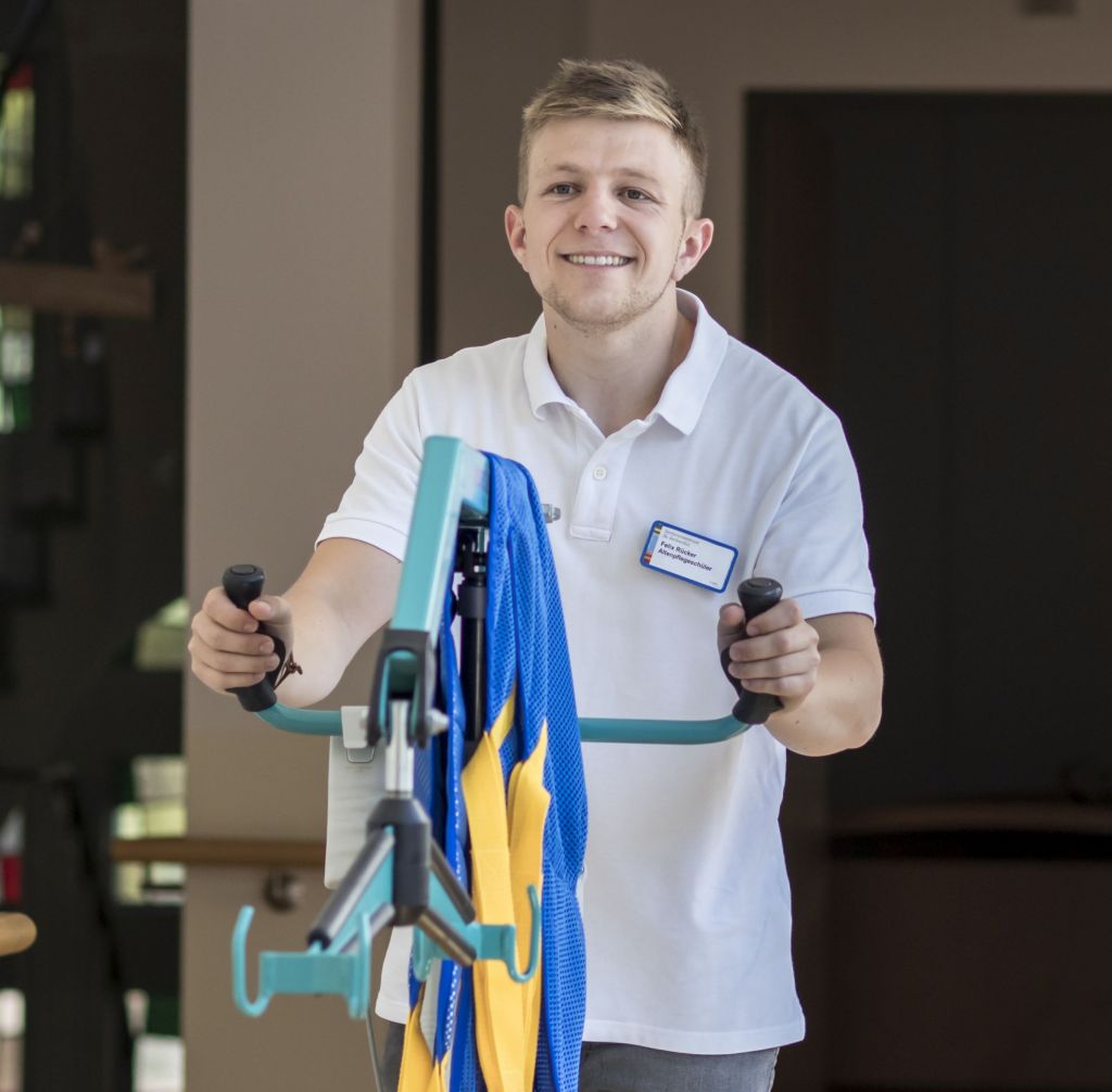Felix Rücker ist zurzeit im zweiten Lehrjahr als Pflegefachkraft. Er hat vorher eine Ausbildung im kaufmännischen Bereich absolviert und sich entschieden, in die Altenhilfe zu wechseln. „Was mich jeden Morgen antreibt zur Arbeit zu gehen, ist der Blick in die Gesichter der Bewohner, die sich freuen und schon von weitem winken. Es ist schön zu sehen, dass das, was ich tue und in der Ausbildung lerne, Früchte trägt.“