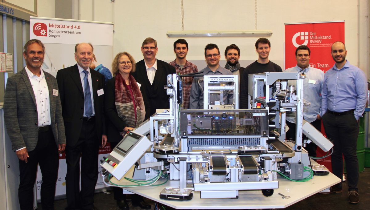 Das Team der Uni und des BVMW an einer FESTO-Fertigungsstrasse im Institut für Technikdidaktik bei Prof. Dr. Ralph Dreher (4.v.l.). Hier wurde den Teilnehmern die automatische Zusammenarbeit von mehreren Maschinen mit Hilfe hinterlegter mathematischer Algorithmen während der Veranstaltung live und zum Anfassen demonstriert. Neben den Abgebildeten waren dort 30 Unternehmen beteiligt, die künstliche Intelligenz bei der Arbeit erleben durften.