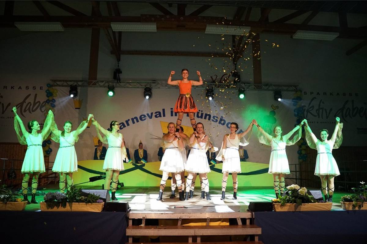 Für das Bühnenprogramm konnte der Dorfgemeinschaftsverein wieder zahlreiche Akteure verpflichten, die mit ihren Auftritten die Stimmung in der Halle zum Kochen brachten. Stammgäste sind dabei die „Wolpertinger“ aus Morsbach, die den Hünsborner Karneval seit vielen Jahren bereichern. Auch die "Biggejungs“ der Bürgergesellschaft Olpe sowie die Printengarde Pink-Weiß aus Rhode mit einer Hommage an Robin Hood sorgten mit ihren Auftritten für beste Laune.