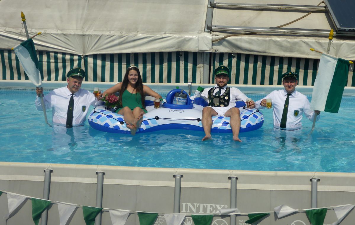"Wenn wir schon kein Schützenfest auf dem Festplatz feiern können, dann wenigstens im hauseigenen Pool mit Zelt dahinter und einem frisch gezapften Krombacher in der Hand." Das meint das Hillmicker Jungschützenpaar Julian Stracke und Julia Mennekes. Das gelungene Foto zeigt sie mit ihren Offizieren Marius Stracke und Thomas (Tommy) Niklas.