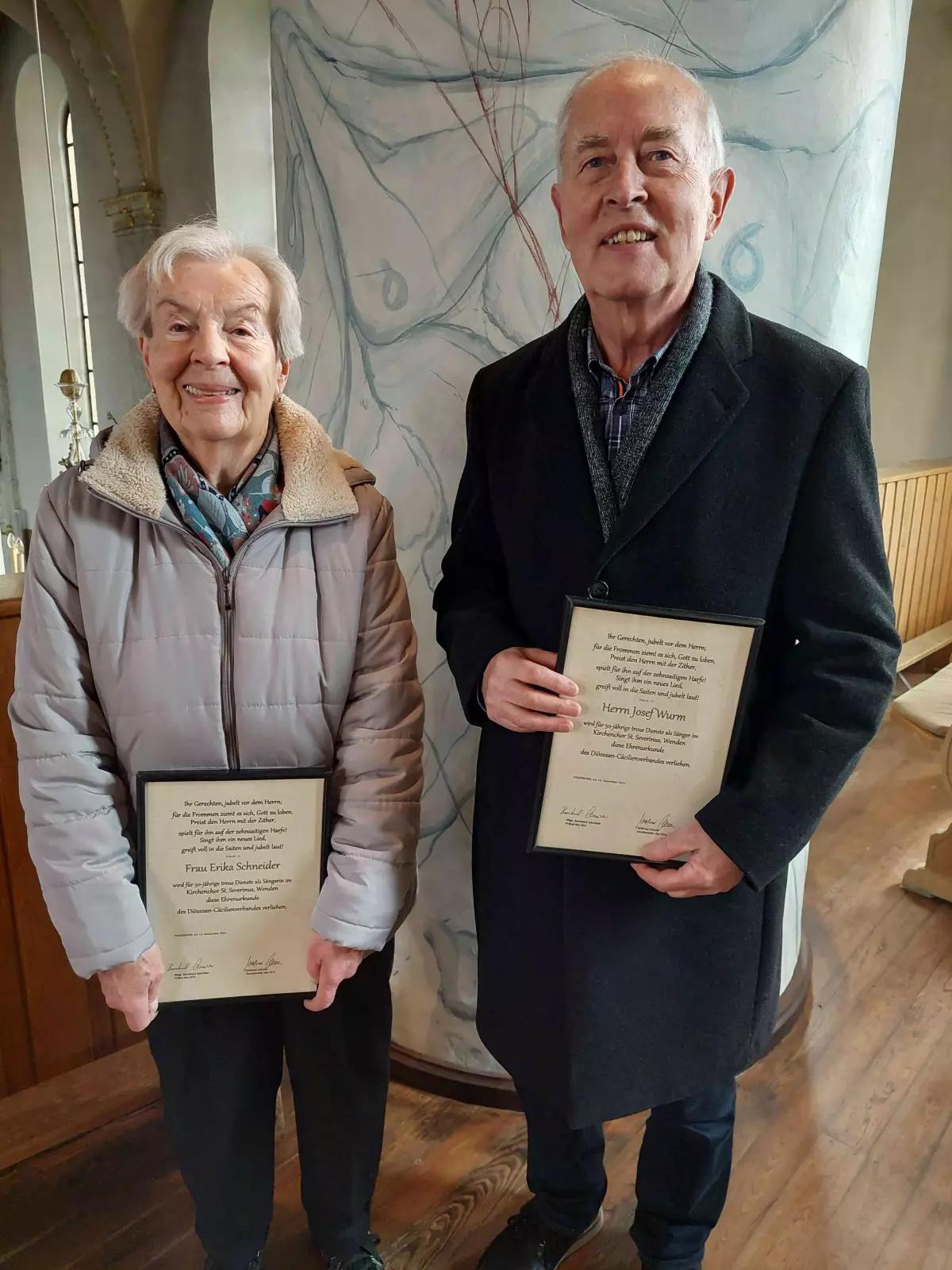 Bei den Ehrungen wurden elf Mitglieder für langjährige Mitgliedschaften geehrt: Gisela Langhammer (10 Jahre), Ingeborg Wirtz und Peter Wrobel (beide 25 Jahre), Ruth Schneider (30 Jahre), Gabi Magiera und Rudi Bongers ( beide 40 Jahre). Seit 50 Jahren dabei und auch heute noch aktiv sind Erika Schneider und Josef Wurm. Ebenfalls sind Anneliese Grebe, Martha Asshoff und Alfons Meurer seit 50 Jahren Mitglieder des Kirchenchores.