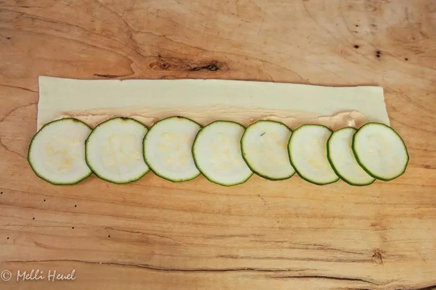 Dann empfehle ich euch diese leckeren Zucchinirosen. Die Verarbeitung erfolgt analog zum süßen Rezept. Bestreicht die Blätterteigstreifen mit pikantem Frischkäse (z.B. Französische Kräuter oder Paprika-Chili) und belegt die Streifen mit dünngehoblelten Zucchinischeiben. Zusätzlich könnt ihr z.B. auch eine Scheibe Schinken oder Salamischeiben mit einwickeln.