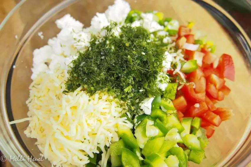 - Gebt die Paprikawürfel, Dill und Frühlingszwiebel in eine Schüssel und fügt jeweils einen El Sesam und Schwarzkümmel zu.