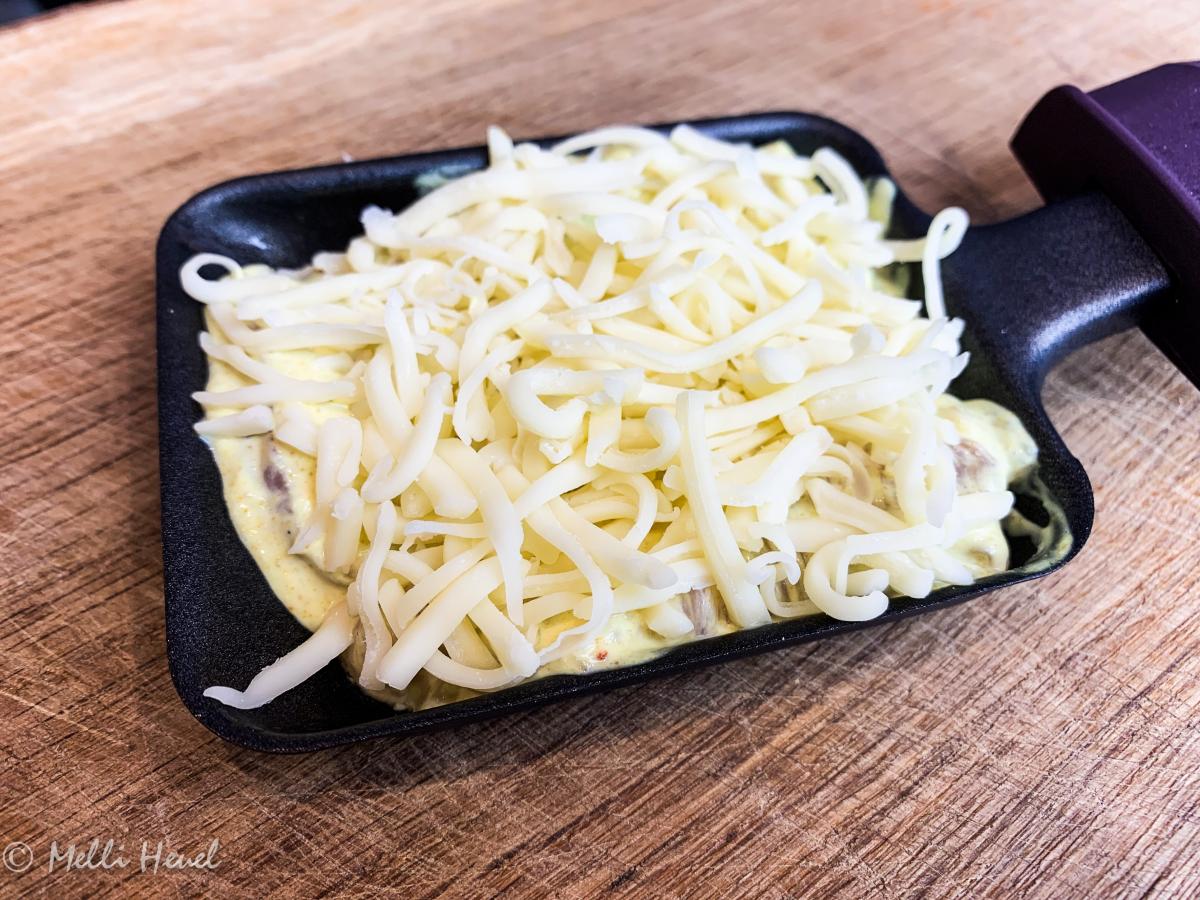 - Pfännchen füllen und 5 Minuten ohne Käse unter dem Raclettegrill garen.