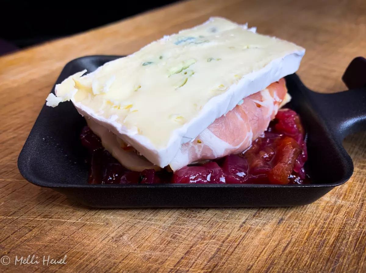 - Mit einer Scheibe Blauschimmelkäse belegen und ca. 6 Minuten unter dem Raclettegrill gratinieren.