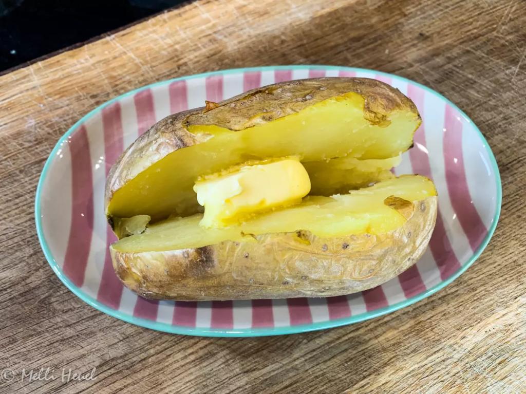 - Gebt ca. 20 g Butter und ca. 2 El Raspelkäse in die Kartoffel und zerdrückt und lockert das Kartoffelinnere mit einer Gabel.