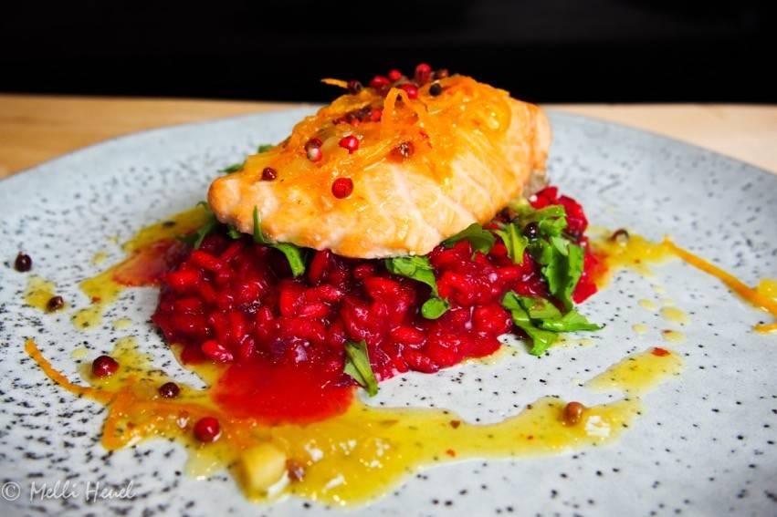 Anrichten: Gebt eine Portion Risotto auf den Teller und bestreut das Risotto mit zerkleinertem Rucola. Darauf platziert ihr den Lachs und gebt etwas Orangen-Pfeffer-Sauce auf den Lachs. Zum Schluss könnt ihr noch einige frische Pfefferbeeren auf den Lachs geben.