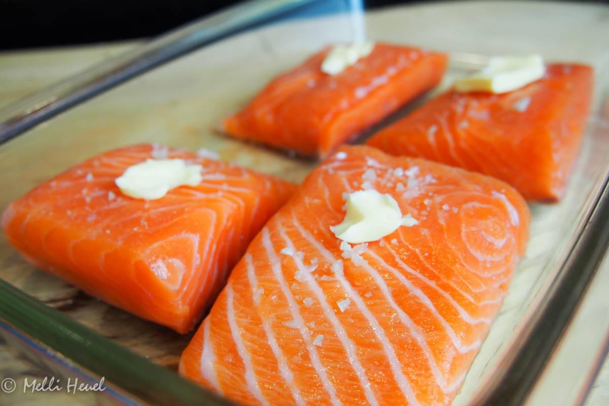 Zutaten pro Person: 100 - 150 g Lachsfilet, je nach dem, ob ihr eine oder zwei Vorspeisen habt, Salz, Butterflöckchen