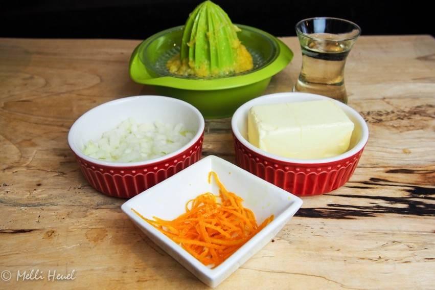 - Schalotten ablöschen mit Weißwein und Orangensaft, Orangenschalen zufügen und köchelnd auf 1/3 einreduzieren lassen.