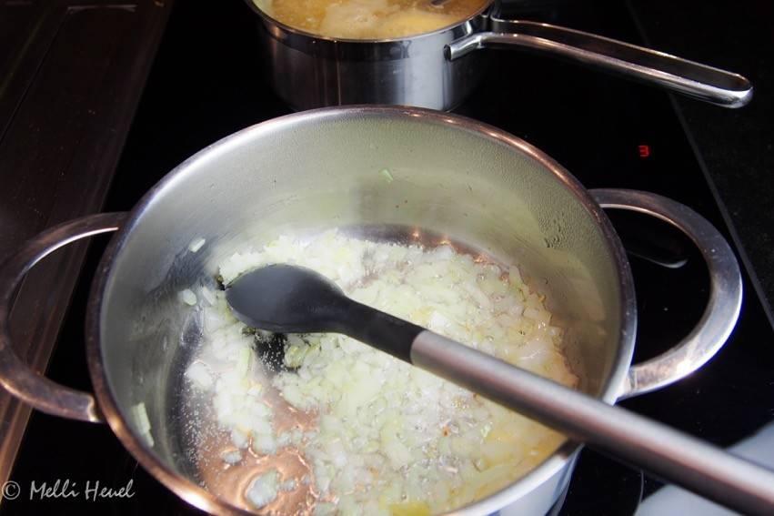 - Schalotte feinwürfeln und in 25 g Butter langsam glasig andünsten.