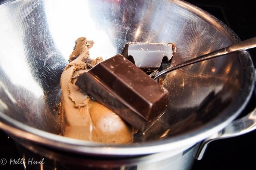 - Nougat und Zartbitter Kuvertüre vorsichtig im Wasserbad schmelzen und anschließend ca. 30 Minuten abkühlen lassen