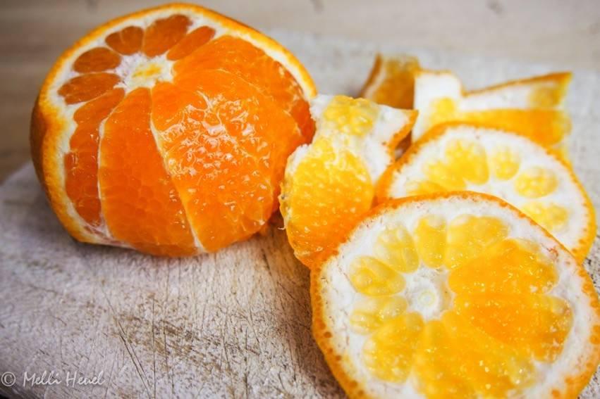 - Clementinen-Schale mit einem sehr scharfen Messer entfernen, sodass die äußere weiße Haut mit entfernt wird
