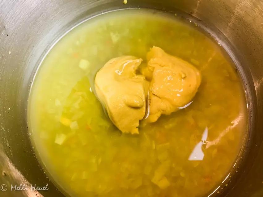 - Gemüsebrühe erhitzen, restliches Rapsöl, Senf und Essig zufügen und glattrühren.