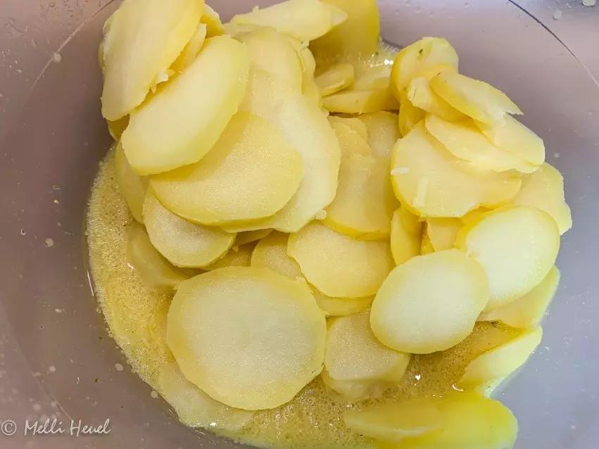 - Noch warme Kartoffelscheiben mit Dressing vermischen und abkühlen lassen.