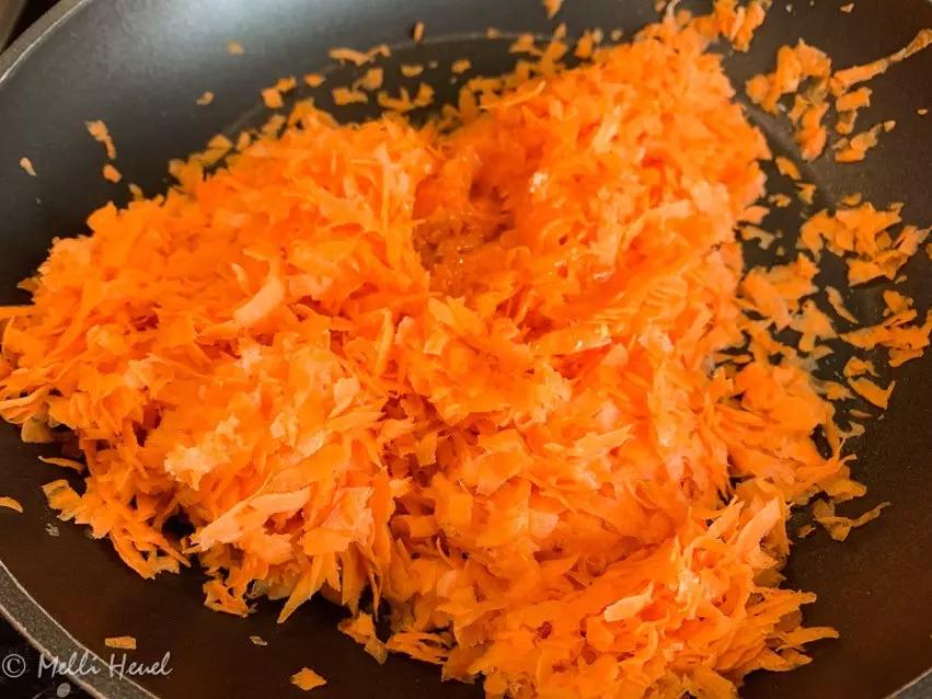 - Möhren schälen und grob raspeln und in einer Pfanne mit 2 El Olivenöl 5 Minuten anbraten und in eine große Schüssel geben.