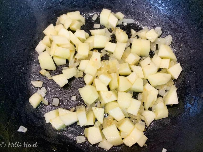 - Butter zerlassen und restliche Schalottenwürfel und die Apfelwürfel anbraten.