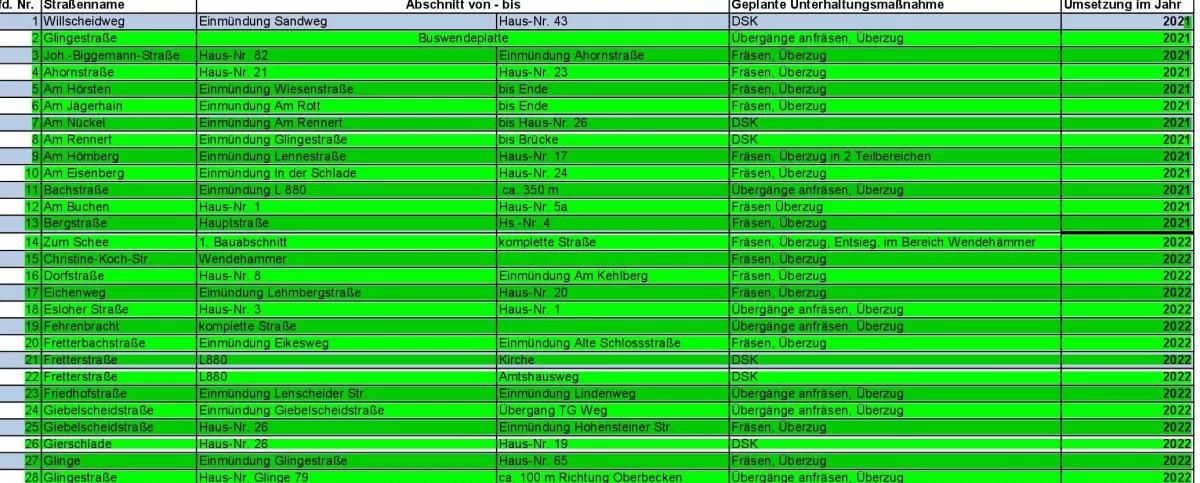 Bei den Maßnahmen handelt es sich um Fräsarbeiten, Asphaltarbeiten und Asphaltdeckenüberzüge. Aus dem Jahr 2021 sollen noch 13 Maßnahmen und im Jahr 2022 weitere 15 Maßnahmen umgesetzt werden