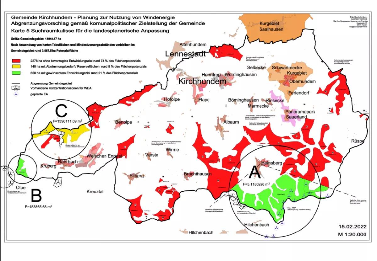 Vorweg: Die Flächen, die für Windkraftanlagen in Frage kommen, wurde beschlossen – mit 16 Ja- gegen 7 Nein-Stimmen. Heißt, die Bereiche in Heinsberg, Rahrbach und Engelsberg (siehe Karte) werden nun genauer unter die Lupe genommen und könnten für Windräder in Frage kommen.