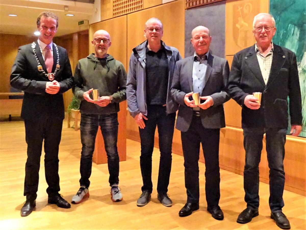 Den Ehrenbecher für Hans-Jürgen Ernst, der sich für die Feierstunde entschuldigen ließ, will Bürgermeister Clemens ihm persönlich überbringen.
