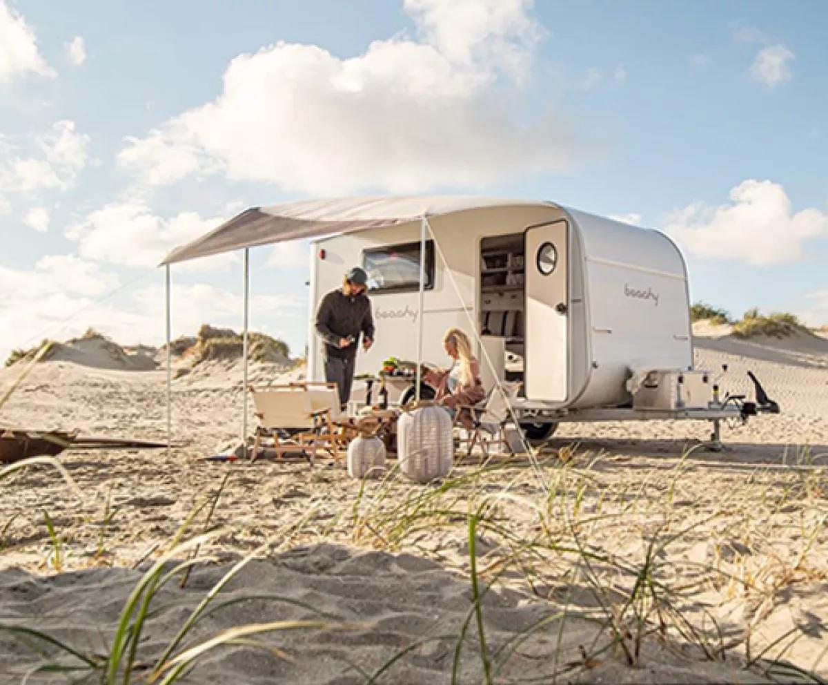 Das Beste kommt heute zum Schluss, unser Beachy ist da! Schon gesehen? Der Beachy ist ein voll ausgestatteter Wohnwagen mit wunderschönem und durchdachtem Design, ideal für euren spontanen Kurztrip oder Urlaub am Strand. Er bietet maximal drei Erwachsenen oder Familien genug Platz für ein paar erholsame Tage. Wer das Camperleben einmal ausprobieren möchte, liegt mit unserem Beachy genau richtig.