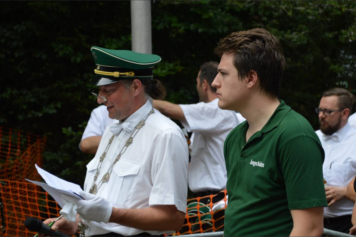 Diese drei, Jan de Vries, Fabian Cramer und Maximilian Springob, waren auch die ernsthaften Bewerber um das Amt des Jungschützenkönigs. Runde um Runde schossen sie auf das hölzerne Federvieh ohne erkennbaren Erfolg. Beim 78. Schuss, abgegeben von Maximilian Springob, drehte sich der Vogel und eine Runde später knickte er in der Mitte ein. Doch danach wieder Stillstand.