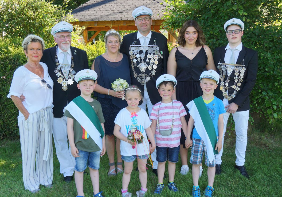 Die amtierenden Majestäten 2018: Kaiserpaar Volker und Anne Riedel, Königspaar Matthias und Andrea Neuhaus, Jungschützenpaar Nils Beckmann und Amani Hassen (v.l.) Kinderkönigspaar Lias Fürth und Joleen Lücking mit den Offizieren Max Kemmerling und Mika Richard (vorne).