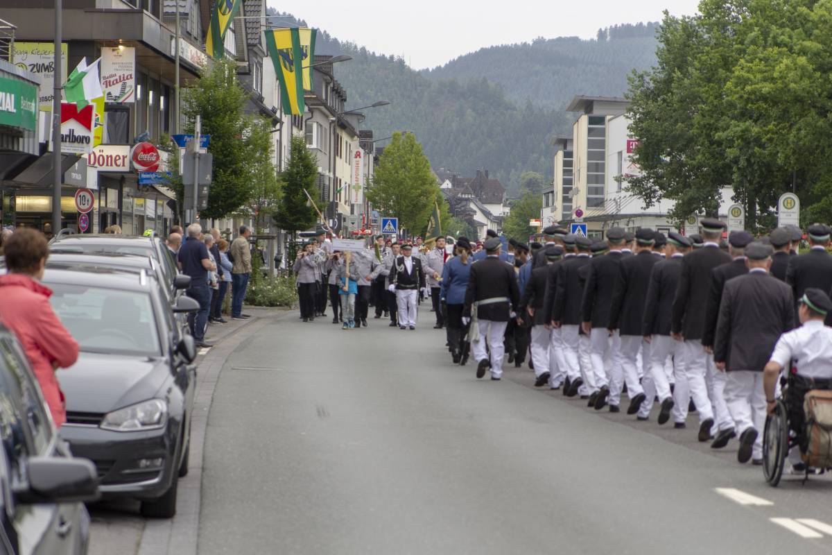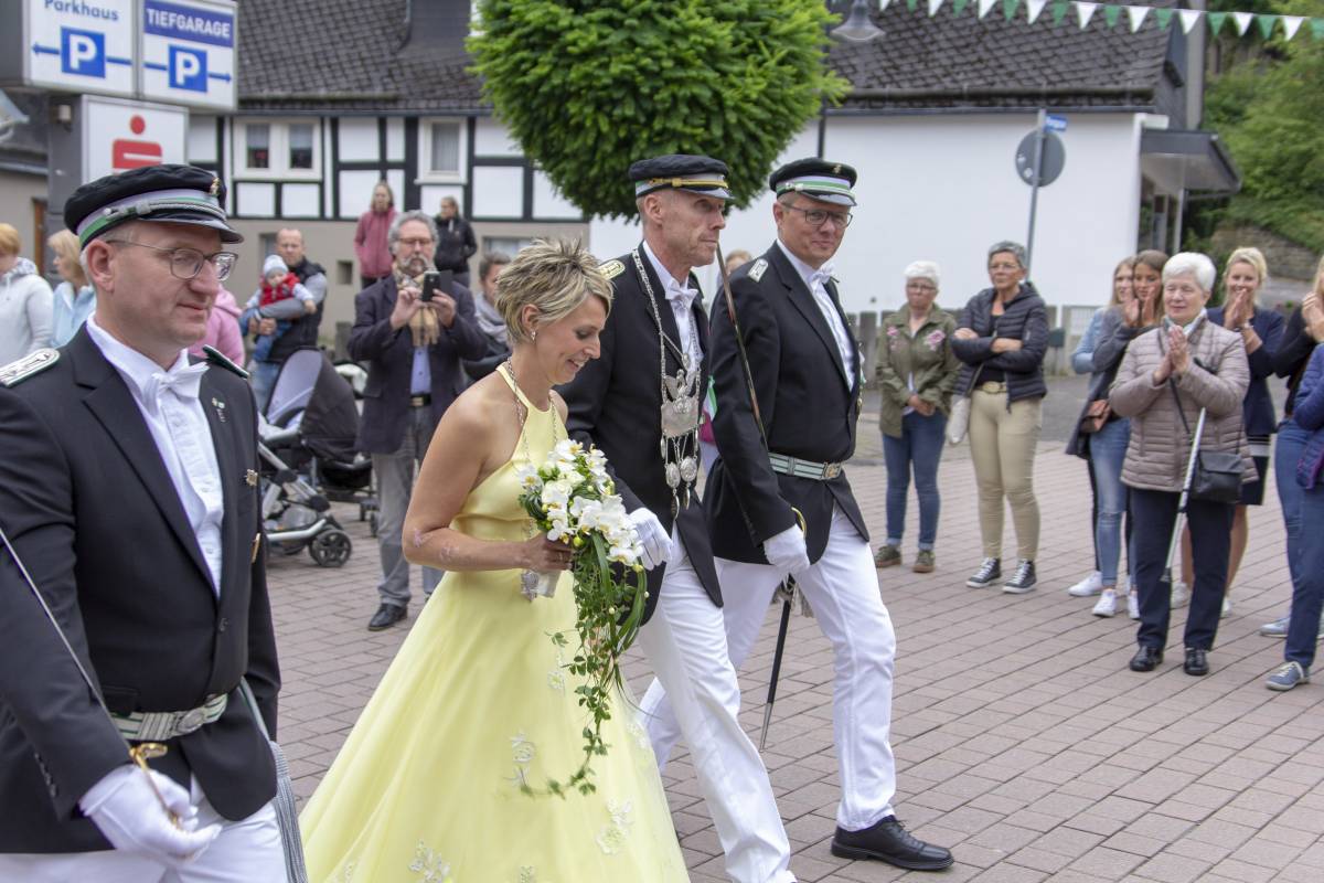 Neben dem Königspaar Martin und Jenny Vollmert bejubelten die zahlreichen Zuschauer an den Straßenrändern auch Jungschützenkönig Leonard Göckeler mit Maria Thöne sowie Kaiser Kurt Kremer. frenetisch Begleitet von den vier Korporalschaften bei festlicher Marschmusik führte der Festzug zunächst vom Thomas-Morus-Platz zum Bahnhof. Von dort marschierten die Schützen zur Sauerlandhalle, wo das Fest am Abend seinen Ausklang findet.