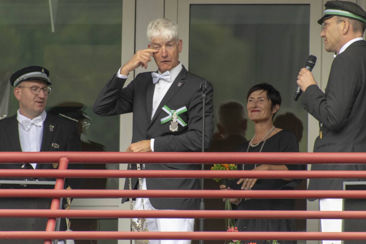 Zunächst hatten sich jedoch Gisbert und Sabine Thöne von ihren Königsketten auf dem Rathaus-Balkon trennen und - unter dem Jubel der Zuschauer - an Martin und Jenny Vollmert übergeben müssen.