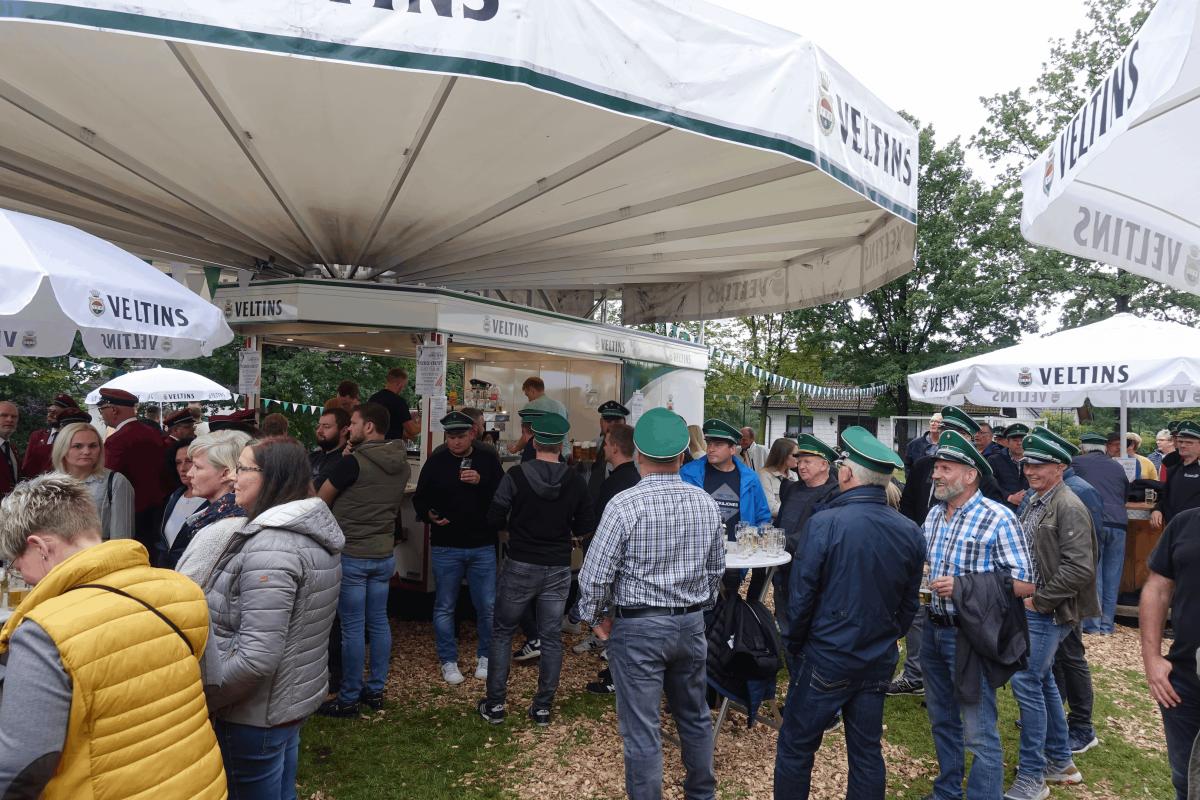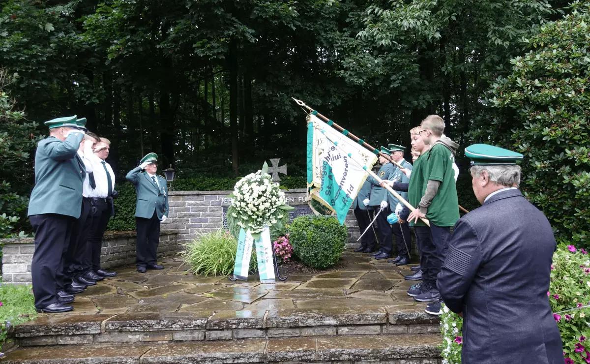 Der Sonntag begann traditionell mit dem Festhochamt - wetterbedingt leider nicht auf dem „Knippchen“, sondern in der Heider St. Antonius-Kirche. Der Musikverein Gerlingen erklärte sich spontan bereit, dieses festlich zu gestalten. Anschließend marschierten Musiker und Schützen zum Ehrenma,l um den Gefallenen der Weltkriege zu gedenken.