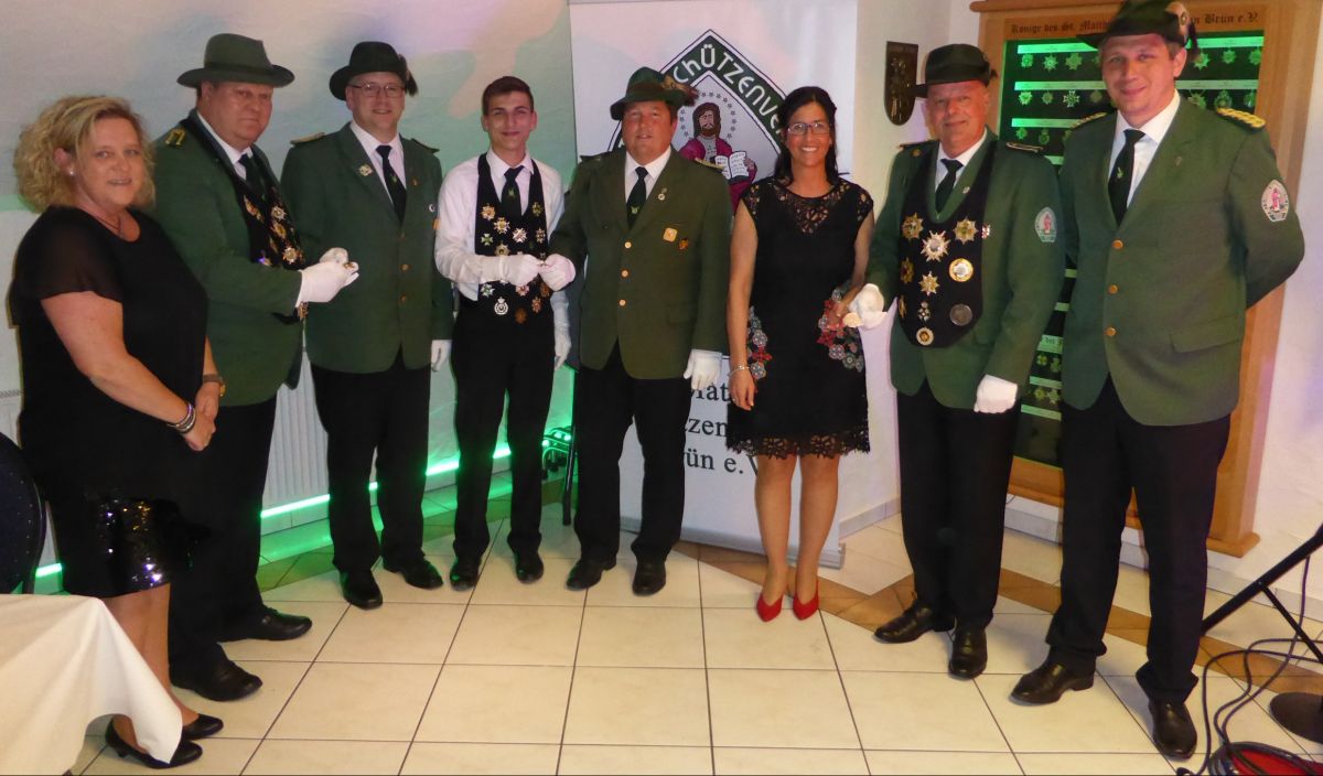 Im späteren Verlauf formierten sich die amtierenden Majestäten zur offiziellen Übergabe ihres Ordens: Kaiserpaar Peter und Martina Knipp, Königspaar Michael und Alexandra Kettner sowie Jungschützenkönig Kilian Wunderlich. Major Fabian Wacker, Hauptmann Florian Stracke und Leutnant Dietmar Dornseifer nahmen diese entgegen.