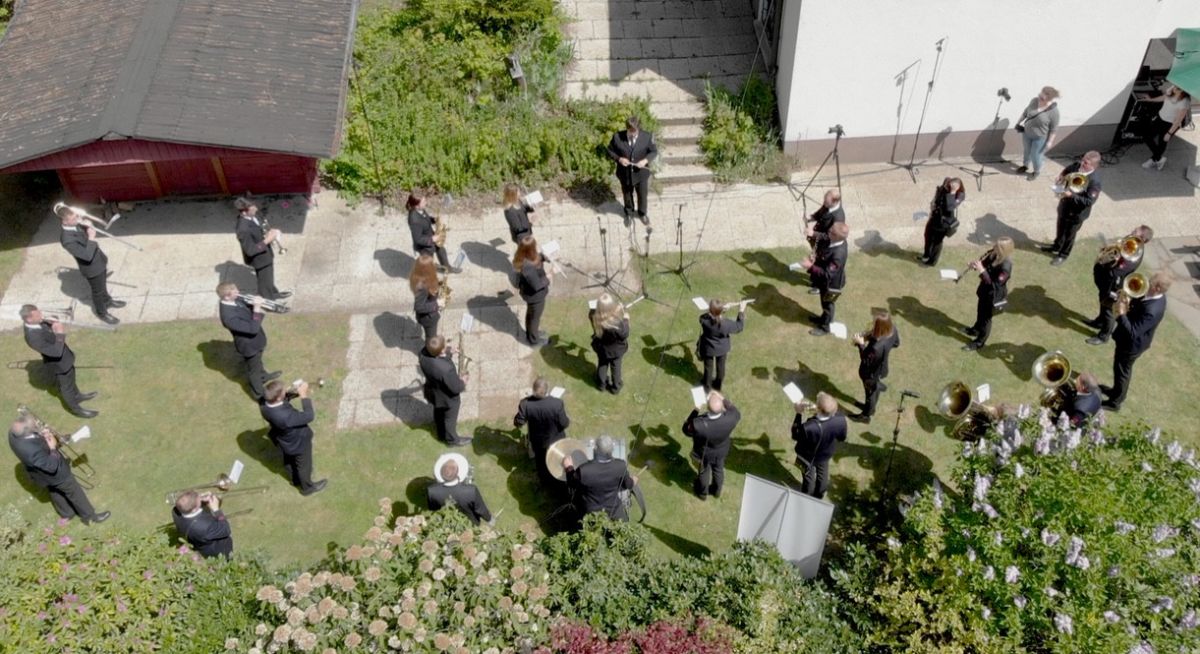 Ganz vorne die aktiven Musiker des Musikzuges und die Schützen vom Schützenverein Römershagen. Am 17. Mai trafen sich alle, um bei schönstem Wetter die Film- und Tonaufnahmen in den Kasten zu bringen - natürlich unter den vorgeschriebenen Abstandsregeln.