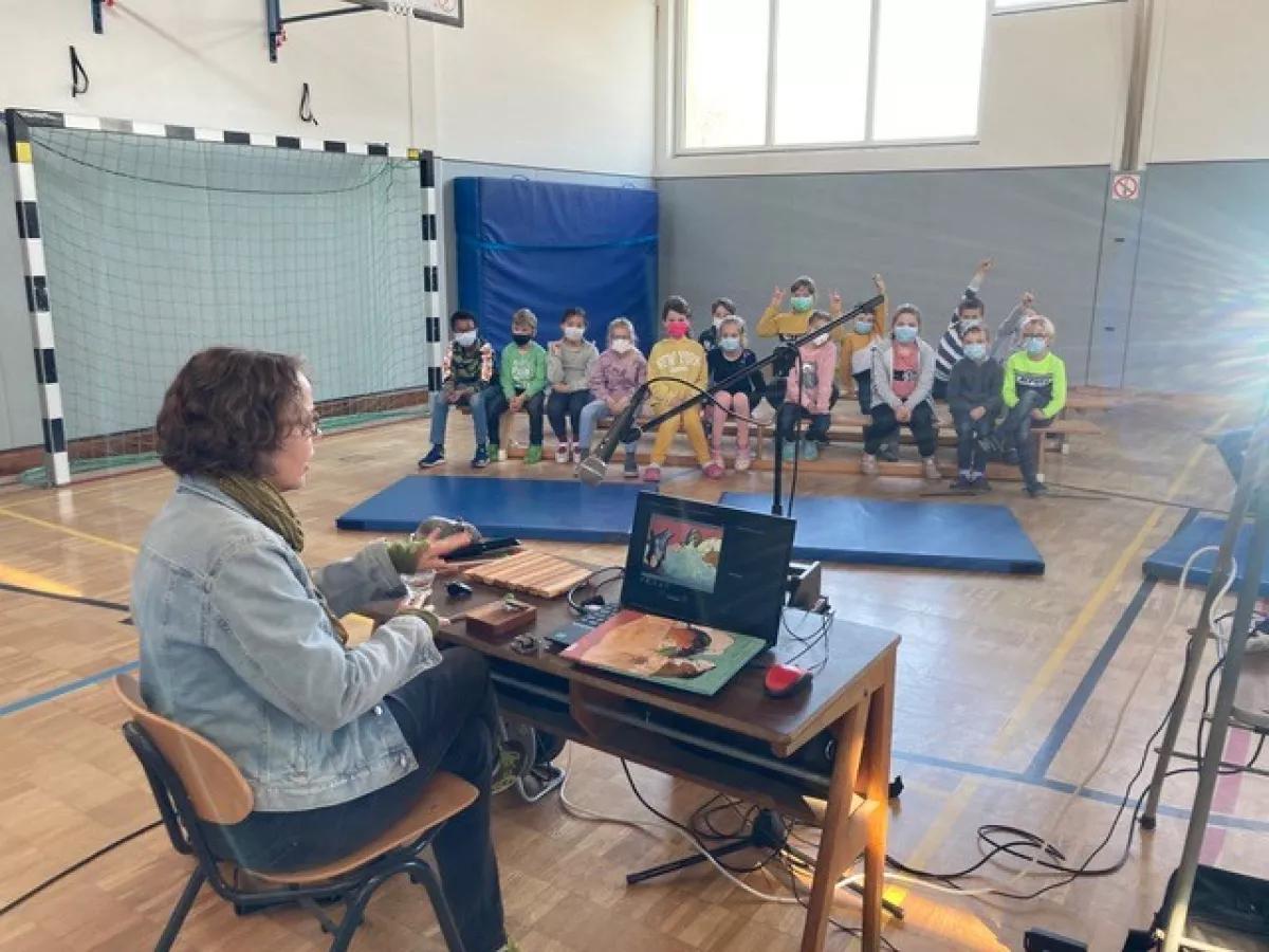 Andrea Behnke hatte für jede Altersklasse etwas dabei. Für die Kinder der Schuleingangsphase gab es ein Bilderbuchkino zum Buch „Was ist bloß mit Opa los?“. Die Drittklässler machten eine musikalische Zeitreise und lernten dabei den Komponisten Jacob van Eyck kennen.