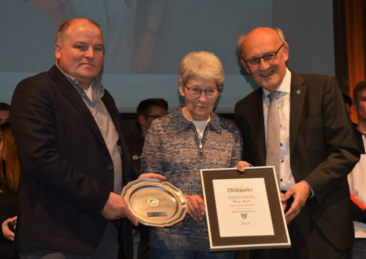 Marga Reuter wurde für 44-jährige ehrenamtliche Tätigkeit beim ESV Finnentrop geehrt. Daneben Bürgermeister Dietmar Heß und Stefan Bischopink.
