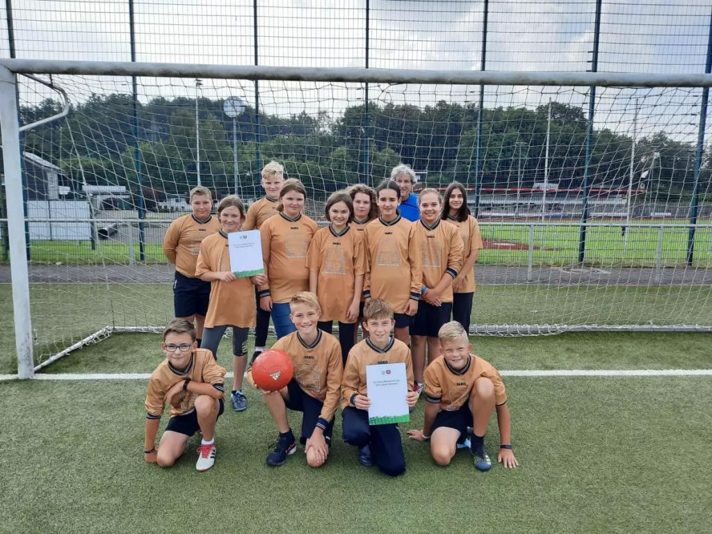 Die Jahrgangstufen sechs sind im Rahmen eines alternativen Leichtathletikteamwettkampfes gegeneinander angetreten, bei dem nach Disziplinen wie Rhythmusspringen, Zeitschätzläufen und Pendelstaffel am Ende die Klasse 6d die Nase vorn hatte.