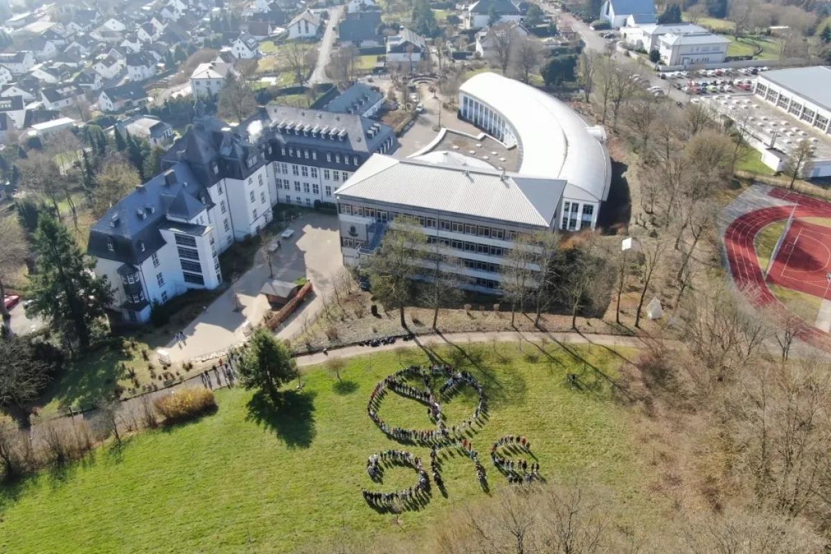 Die politisch engagierten Schülerinnen mobilisierten kurzerhand die Klassen 5, 6 und 7 ihrer Schule, um gemeinsam ein Friedenszeichen zu stellen. So versammelten sich rund 220 junge Friedensaktivisten auf der Schulwiese, um das Peace-Zeichen und den Schriftzug „SUG“ zu formen.