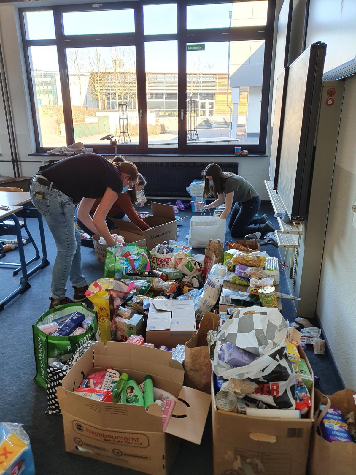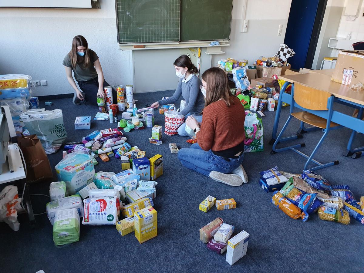 So kamen insgesamt rund 60 große Kisten mit Hygieneartikeln für Kinder und Erwachsene, haltbare Lebensmittel, Medikamente, Verbandsmaterial, Tiernahrung, Batterien und Taschenlampen zusammen, die die Schüler mit ihren Lehr- und Integrationskräften in den Pausen sortierten und sorgfältig in die Kisten verpackten.