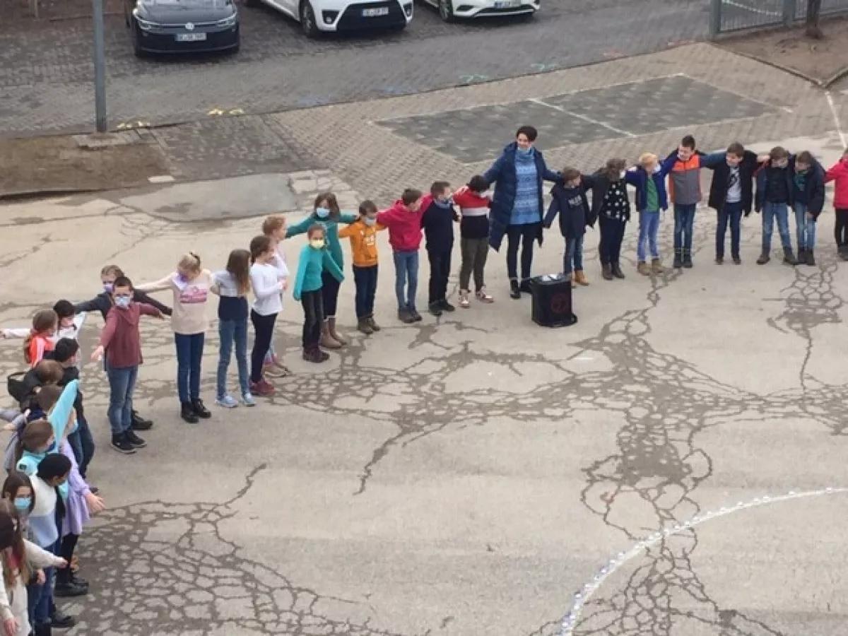 Vikar Nguyen brachte den Kindern das Überwinden von Grenzen nahe, in dem er auch die kleinen Ortsgrenzen in den Blick der Kinder rückte. Dass auch Menschen ihr Arme ausbreiten können und sich so gegenseitig Sicherheit geben, stellte er mit Jesus am Kreuz sehr bildhaft dar. Im Anschluss an die Andacht versammelten sich alle auf dem Schulhof.