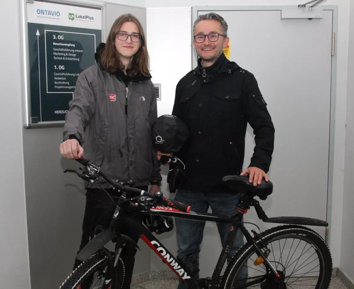 Im strömenden Regen kommen Andrii und Matthäus mit dem Fahrrad an der LokalPlus-Redaktion an. Triefend nass, aber strahlend: Matthäus freut sich, dass sich sein Schützling, den er von der ukrainischen Grenze mit nach Lennestadt brachte (LP berichtete), so gut eingelebt hat. Und Andrii ist glücklich, dass er es hier so gut angetroffen hat – und dass er aus der EiL-Fahrradwerkstatt dieses tolle Mountainbike bekommen hat.