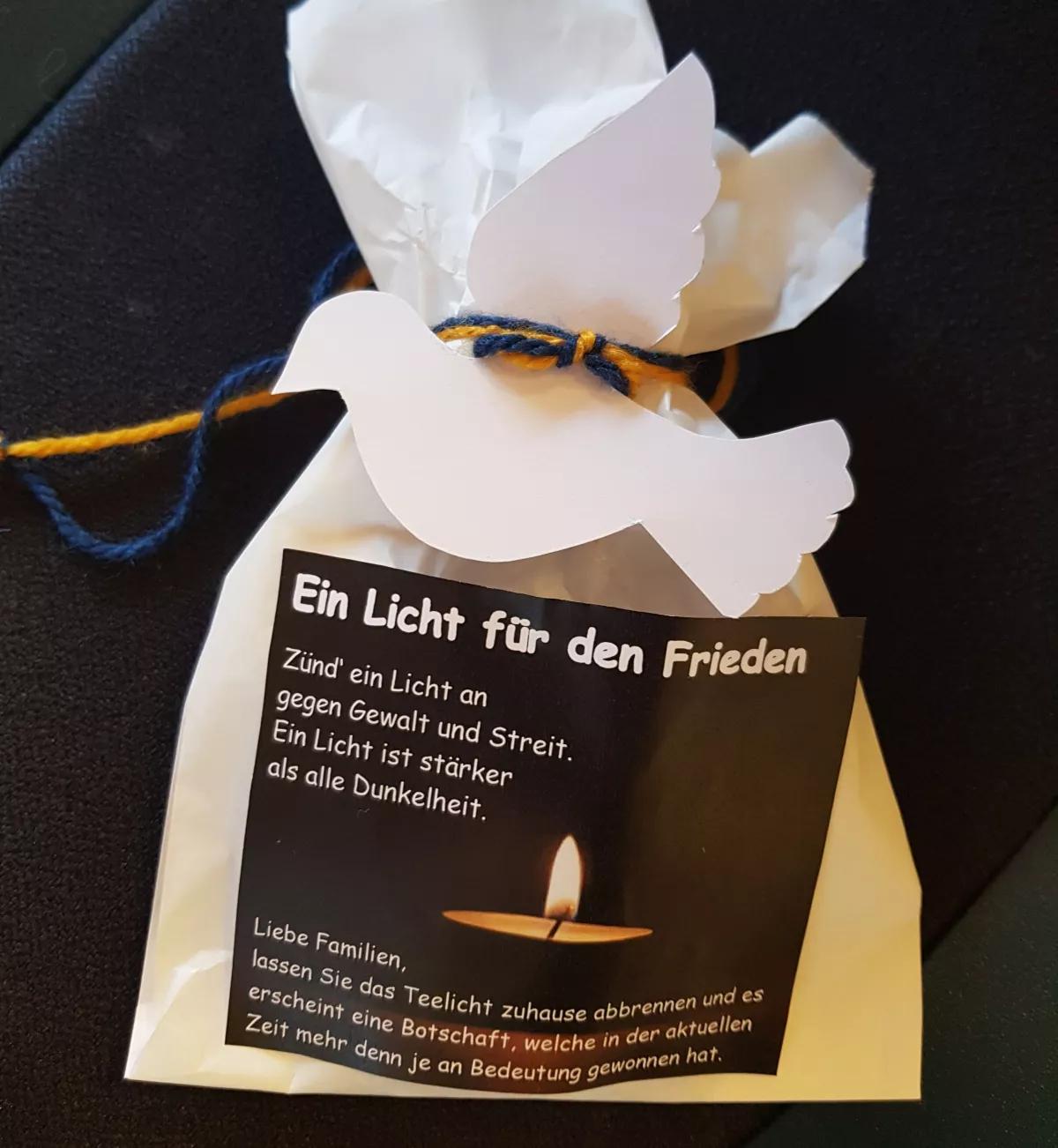 Die Kinder haben diese Päckchen jedoch nicht nur für ihre eigenen Familien gebastelt, sondern für alle, die in dieser Zeit ebenfalls ein Licht für den Frieden entzünden möchten. Ab kommender Woche, 21. März, kann sich jeder, der mag, ein solches Friedenslicht am Eingang der Kita abholen (solange der Vorrat reicht).