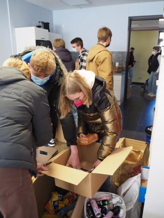 Die Schülervertretung hatte innerhalb der Schule zu Spenden von Hygieneartikeln und Lebensmitteln aufgerufen und in drei Tagen eine riesengroße Menge an Spenden erhalten. Insgesamt 28 große Kartons kamen dabei zusammen.