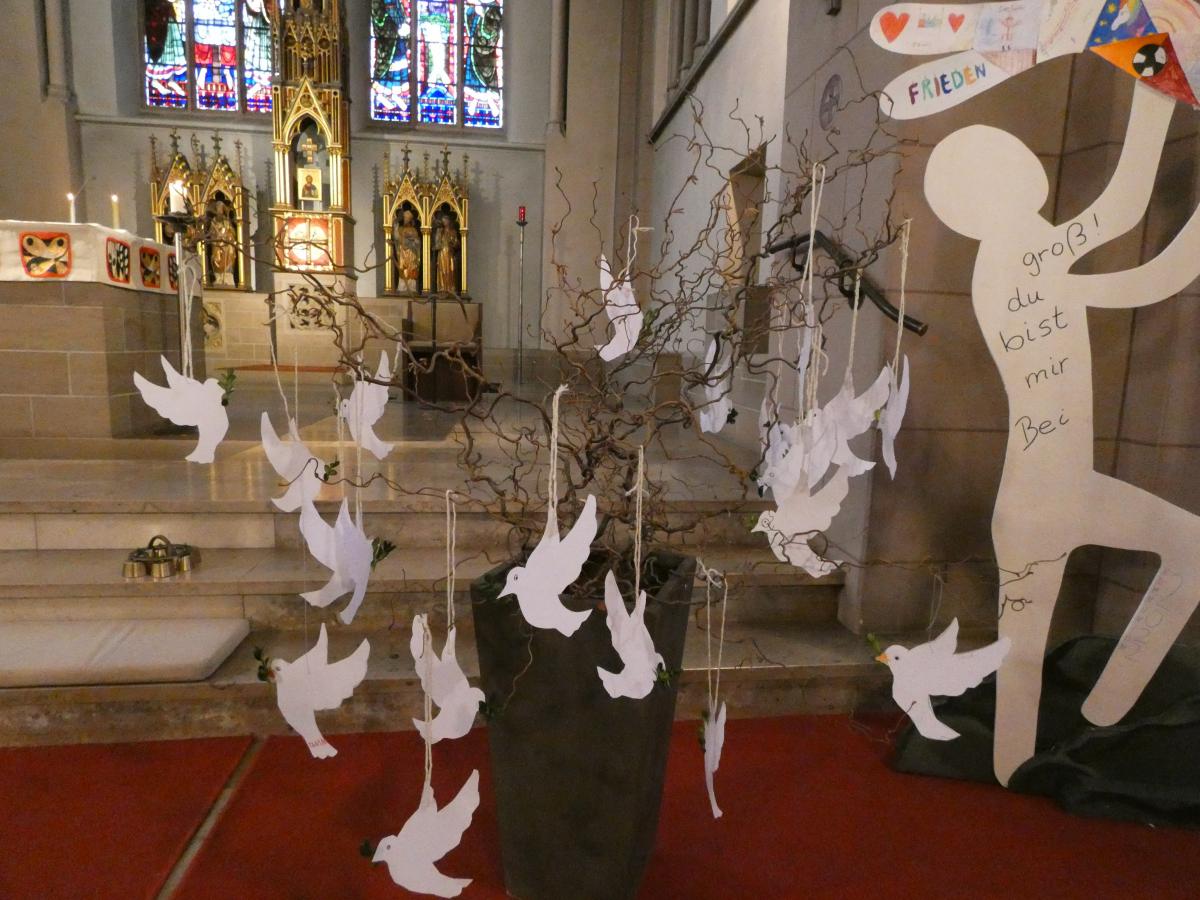 Zuvor hatten sie für die Andacht Friedenstauben gestaltet, welche sie dann in der Kirche aufhängten. Gemeinsam konnte so mit den Familien ein Zeichen für den Frieden gesetzt werden.