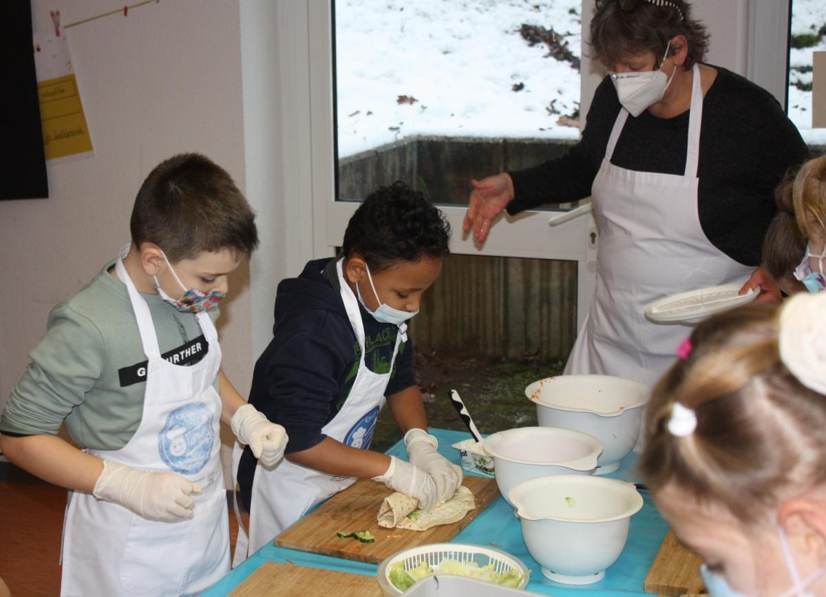 Indischer Lassi, spanischer Milchreis sowie amerikanische Wraps standen auf dem Kochplan . Die 20 Schüler waren mit Eifer dabei und lernten mit viel Spaß, wie man frische Lebensmittel fachgerecht zubereitet. Zum Abschluss wurden die selbstzubereiteten Gerichte gerne gegessen.