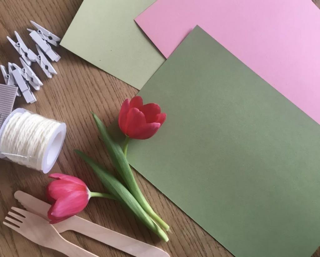 - Buntes Papier, Mini-Wäscheklammern, Holzbesteck, Wolle, eine Blume deiner Wahl, doppelseitige Klebesticker