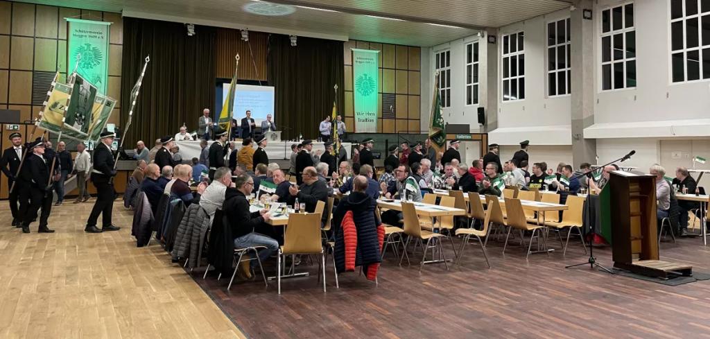 Bewährt hat sich mittlerweile die Jubilarehrung auf der Mitgliederversammlung für 25 und 40-jährige Mitgliedschaft. Dazu marschierte die Fahnenabordnung der Offiziere und Schützenzüge ein und gaben der Ehrung einen würdigen Hintergrund.