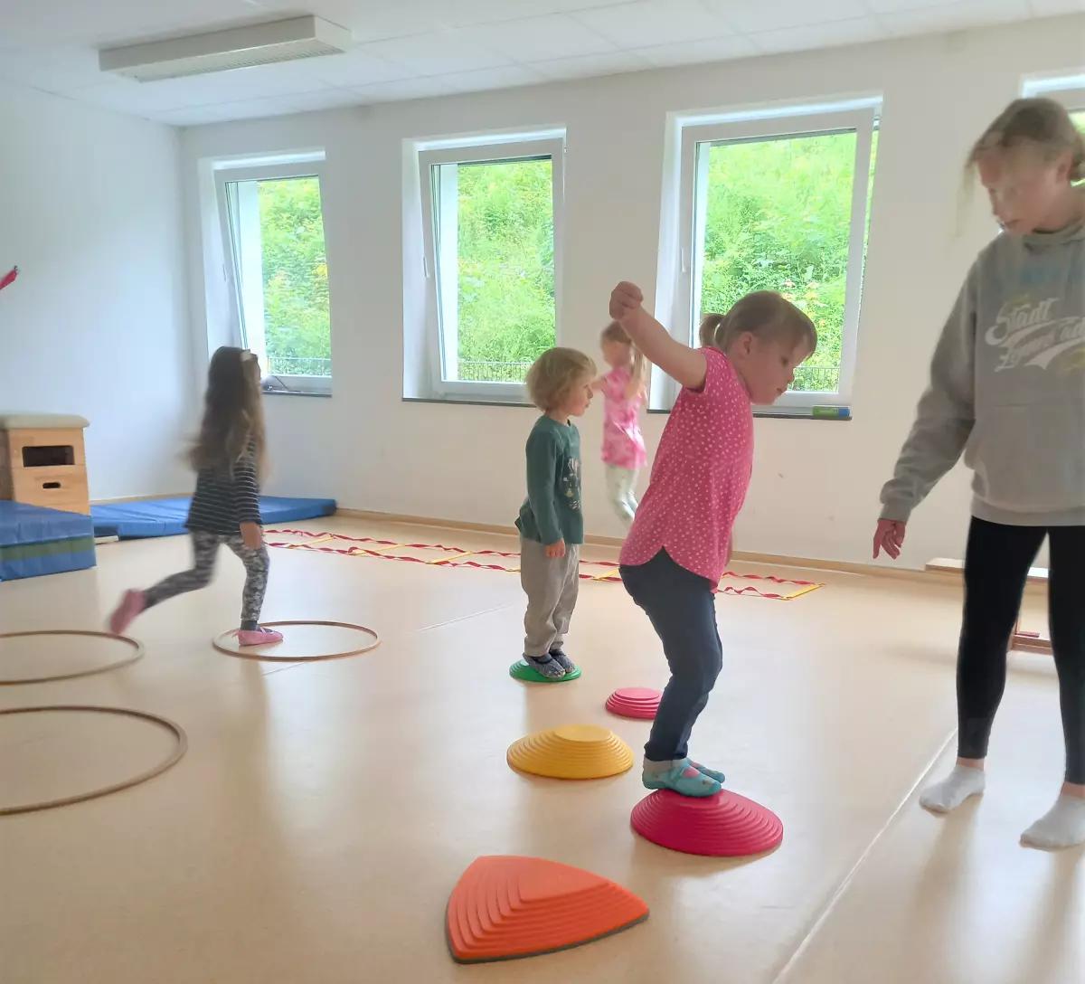 Das frisch gewonnene Wissen setzen die Sporthelferinnen des SCO tags darauf direkt um. In drei Kleingruppen von jeweils sechs bis acht Kindern und je zwei Sporthelferinnen konnten sich die Mädchen und Jungen des Kindergartens Sankt Lambertus austoben.