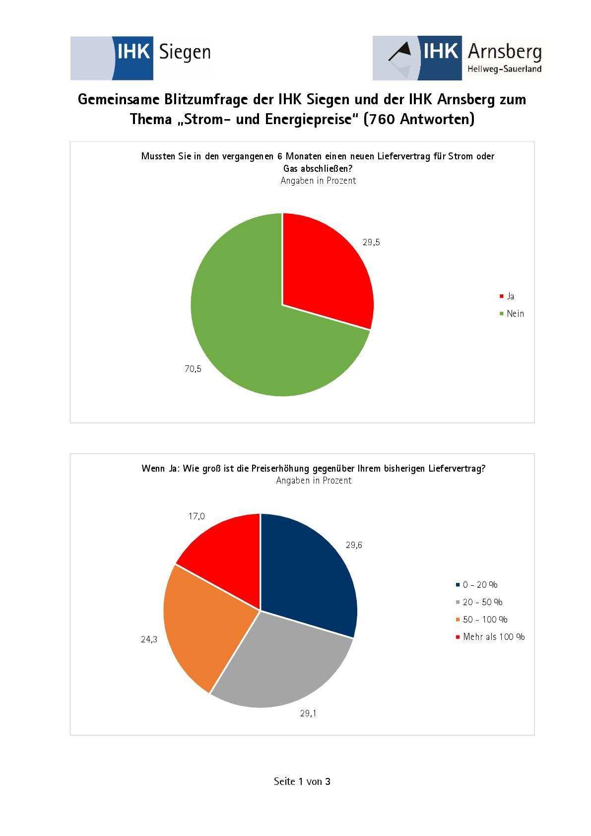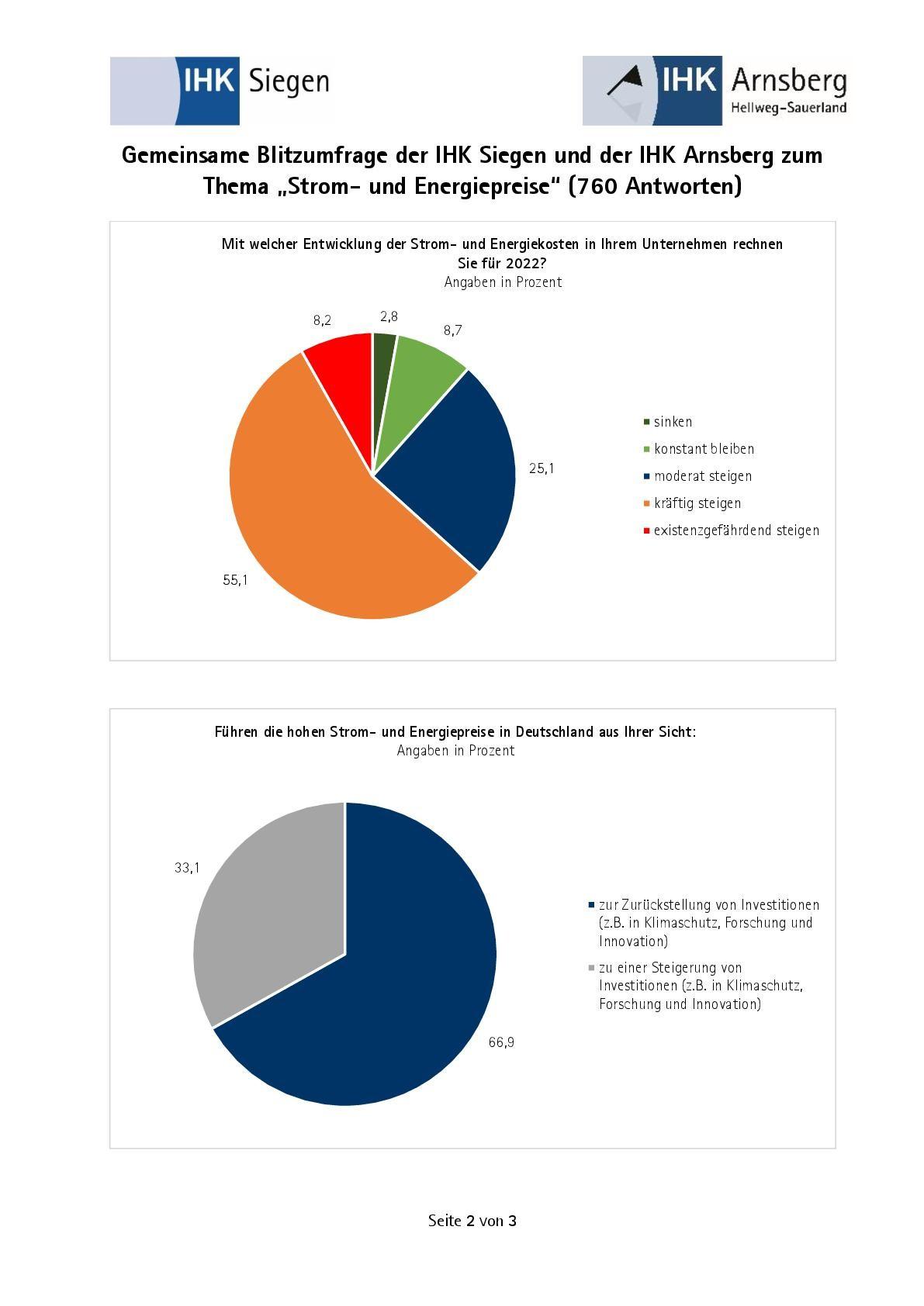 Die Mehrheit geht von weiter steigenden Preisen aus. Das habe fatale Folgen für den Wirtschaftsstandort: Nicht wenige Unternehmen erwägen demnach bereits Standortverlagerungen, kommentieren die IHK-Präsidenten Felix G. Hensel (Siegen) und Andreas Rother (Arnsberg) die Ergebnisse Umfrage, an der sich 760 Unternehmen beteiligten.