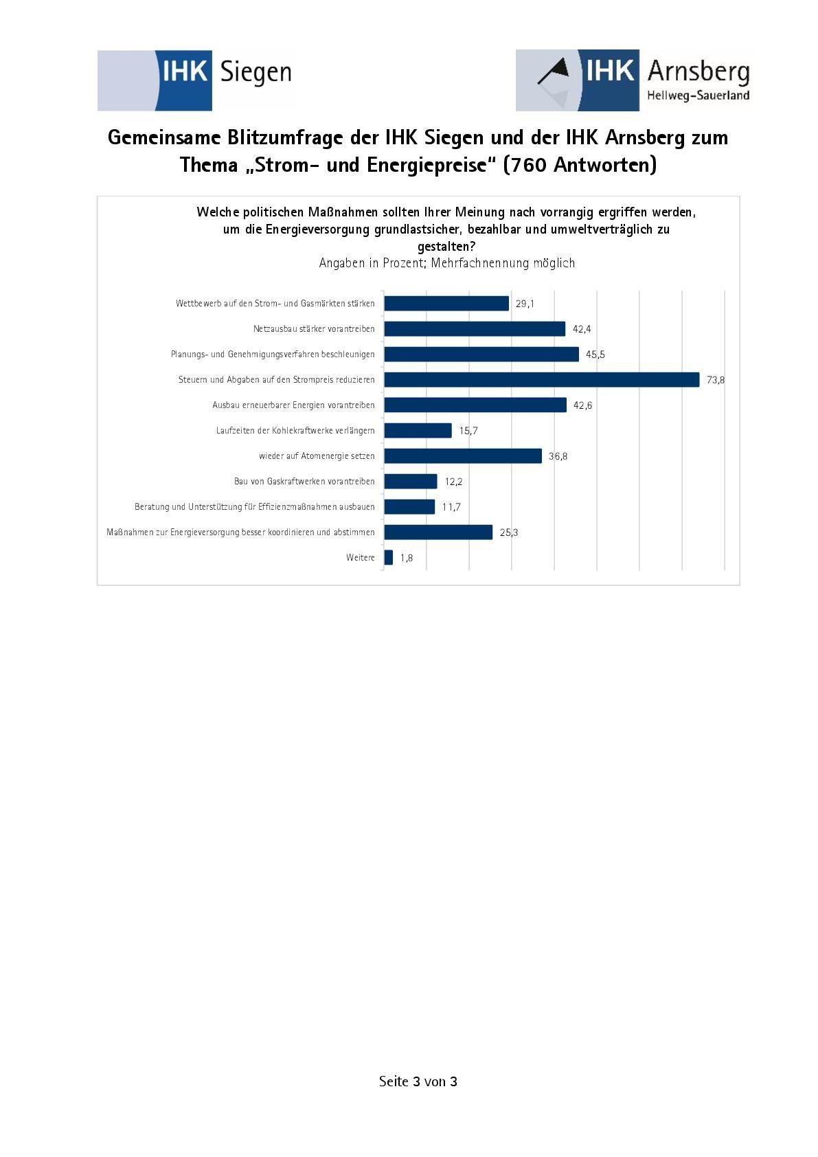 Auf Nachfrage, nach den vorrangigen politischen Maßnahmen, die Energieversorgung grundlastsicher, bezahlbar und umweltfreundlich zu gestalten, geben 74 % der Unternehmen an, dass die Steuern und Abgaben auf den Strompreis gesenkt werden sollten.